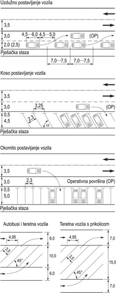 traži dalje ...parkiralište (engl. parking area, parking place; njem. Parkplatz; rus. автостоянка), vanjska površina namijenjena smještaju vozila kada nisu u vožnji. Može biti u sklopu javne prometnice (ceste, ulice) ili izdvojeno od nje. Mogućnost pristupa i raspoloživa površina za parkiranje određuju način smještaja vozila, koji može biti uzdužan, kos i okomit na os ceste ili prilaznoga traka. Kada su parkirna mjesta u sklopu prometnice (npr. uzdužno postavljena), pristupa im se izravno iz voznoga traka, što loše utječe na sigurnost prometa. Zato su izdvojene parkirne površine znatno bolje rješenje, na kojima se vozila uglavnom smještaju koso i okomito. Veličina parkirnoga mjesta te širina pristupnoga traka ovise o vrsti vozila (osobno, teretno, autobus) i o načinu postavljanja vozila. Za teretna vozila i autobuse uglavnom se primjenjuje koso postavljanje (pod kutom 45°).