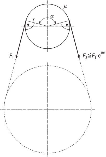 traži dalje ...trenje užeta (engl. belt friction; njem. Seilreibung; rus. трение ремня), trenje između valjkastoga tijela i užeta, remena, lanca i dr. koji su preko njega prebačeni ili omotani. O njem ovisi učinkovitost različitih remenskih pogona, pojasnih kočnica, koloturnika i sl. Uže prebačeno preko valjka, opterećeno različitim silama F1i F2 u krakovima (npr. F2 > F1), neće proklizivati (ravnoteža užeta) samo ako postoji trenje između užeta i valjka. To trenje ovisi o koeficijentu trenja μ i dijelu valjka što ga uže obuhvaća (iskazuje se obuhvatnim kutom α), pri čem je ravnoteža određena izrazom: F2 ≤ F1 · eμ · α. Na valjak polumjera r može se tako preko trenja prenijeti moment: M = F1 (eμ · α – 1) r.