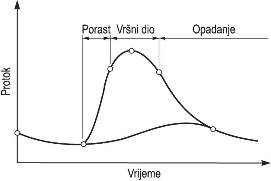 traži dalje ...vodni val (engl. water wave, flood wave; njem. Hochwasserwelle; rus. водная волна), nailazak velikih vodnih količina koritom vodotoka. Obično je prouzročen obilnim oborinama ili naglim topljenjem snijega i leda na nekom slijevnom području. Prikazuje se hidrogramom ili nivogramom, odn. promjenom protoka ili razine vode tijekom vremena na nekome mjestu. Povećanje protoka prouzročuje porast, stalnost protoka stagnaciju, a smanjivanje protoka opadanje vodnoga vala. Osnovne su sastavnice vodnoga vala vrh, koji označuje najveći protok (razinu vode), duljina, tj. njegovo trajanje, i oblik.